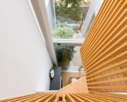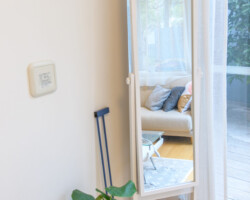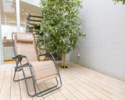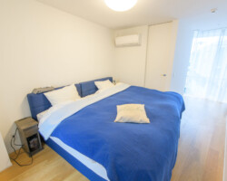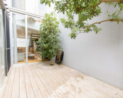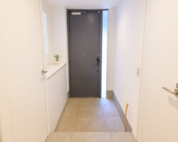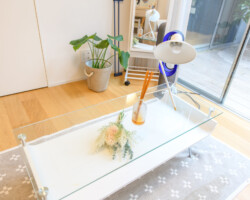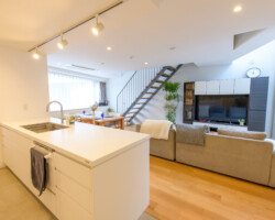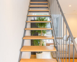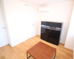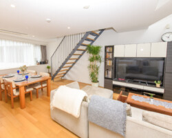 メゾネット仕様、白壁にウッドフローリングとシンプルな家具を揃えたロケーション。